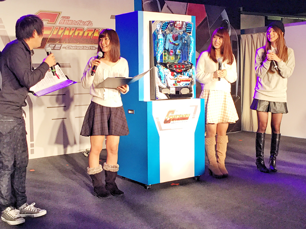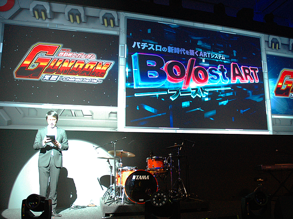 モビルスーツに囲まれた会場に入るとまずは青いLEDをまとったガンダム像が出迎え、ステージ上で機動戦士ガンダムのイメージムービーが流れました。試打コーナーには実機が並び、遊技したい方が続々と着席しすぐに満席に。期待度の高さが伺えました。開演時間が近づくにつれてご来場者が続々と増え、開演前には大勢の方で溢れる熱気ある会場となりました。